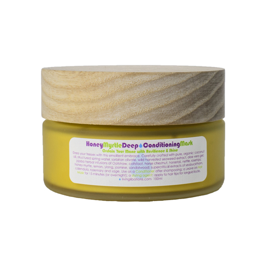 Dress your tresses with Living Libations Honey Myrtle Deep Conditioning Mask. It is our thickest, richest, most luxurious happy-hair care to date. Heaven-scented and carefully crafted with pure, organic, wild-harvested herbs, essential oils, aloe, and emollient oils, this rinse-out or leave-in conditioning mask is soothing for dry hair, dry scalp, damaged and over-processed hair, and all hair types desperately seeking a strengthened state of hair-homeostasis.